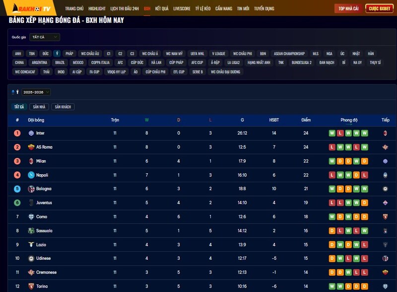 Nếu bạn là fan Serie A, fan của Juventus, Inter, AC Milan, Roma, Lazio hay Atalanta… Nếu bạn là người học chiến thuật, người thích phân tích dữ liệu hay người chơi kèo dài hạn… Thì bảng xếp hạng bóng đá Ý trên Ra Khoi TV chính là công cụ bạn không thể bỏ qua!