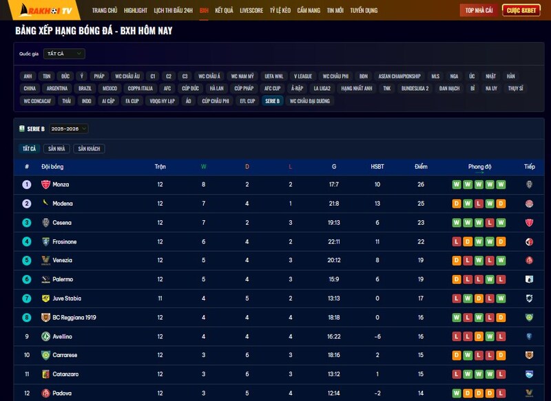 Ngay bên cạnh bảng xếp hạng bóng đá Ý, bạn sẽ thấy: