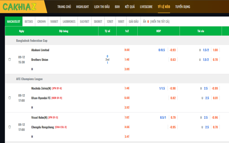 Một trong những điểm mạnh nổi bật của Cakhia TV chính là khả năng cung cấp tỷ lệ kèo một cách nhanh chóng và chính xác. Người chơi có thể truy cập nền tảng và ngay lập tức xem được: